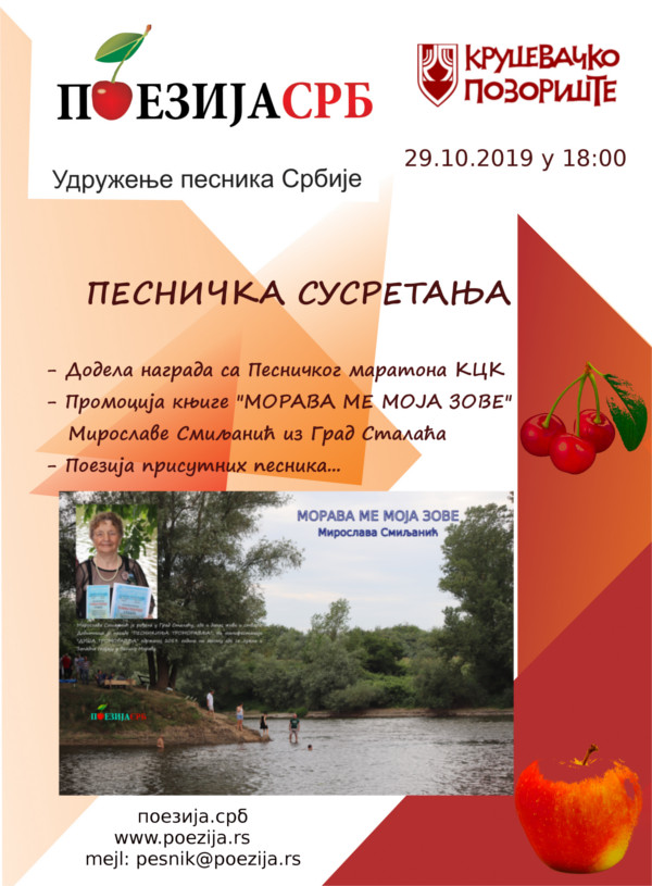 Удружење песника Србије – ПоезијаСРБ наставило је са организовањем манифестације ПЕСНИЧКА СУСРЕТАЊА у Крушевачком позоришту 29.10.2019. године у 18:00 сати. Програм је био богат и разноврстан и састојао се из три дела: